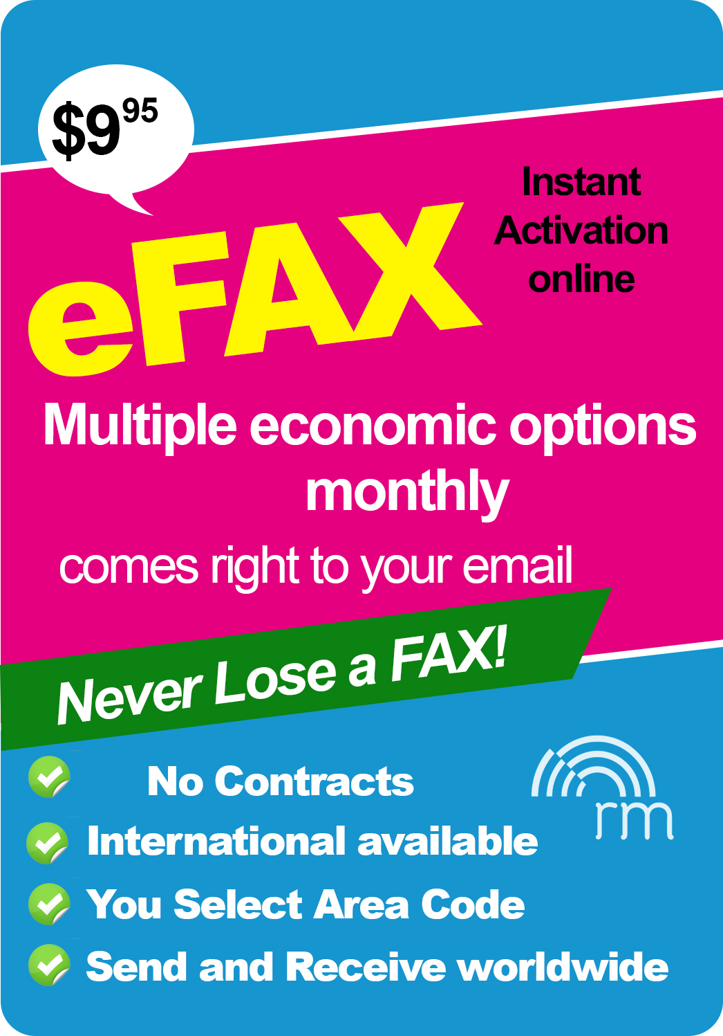 Get the flexibility of eFAX and never miss a FAX again. FAXes are delivered direct to your email and are opened like any attachment. Easily send a FAX anywhere worldwide from your email. Let yourself be mobile and not wait for a FAX at your office. All systems are completely customizible ...