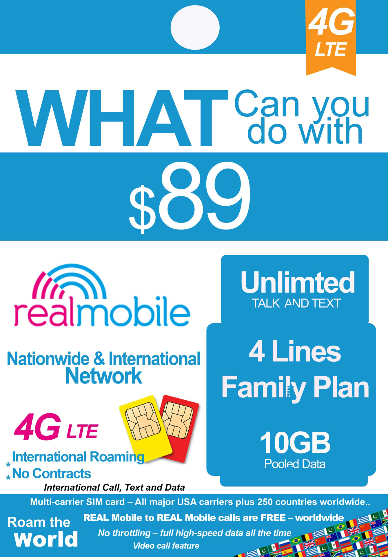 With the REAL Mobile multi-carrier SIM installed in your smartphone you will always connect to the strongest carrier. Both in the USA and in over 250 Countries Worldwide. This is the best plan for unlimited data Plan. Data is Unlimited ** … included with this low price! The prepaid Family Plan comes with TEN(10) GB of High Speed 4G LTE Data shared by four lines. Add more fuds if needed easily from your phone or set with auto-pay.